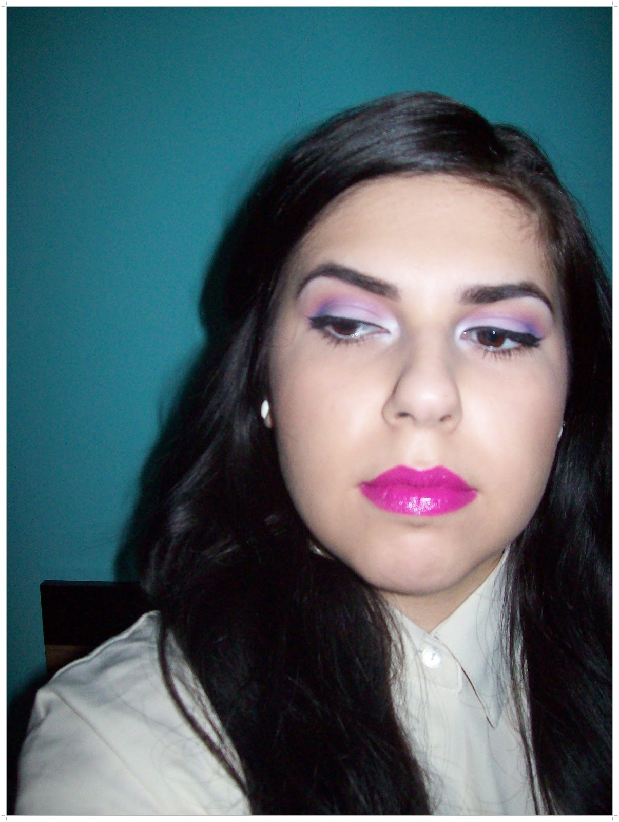 Eu am ales sa fac un machiaj in culori pastel de lila ,oranj si mov ,iar pentru cloarea buzelor am optat pentru un ruj fuchsia, foarte intens.
